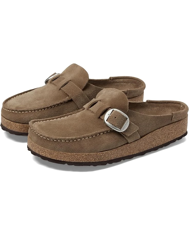 - The BIRKENSTOCK Buckley is a semi-open moccasin-style clog thats instantly recognizable as an authentic BIRKENSTOCK original thanks to its thick cork sole. The striking stitching catches the eye. This version comes with our popular Big Buckle. Its natural design is down to the upper made from especially soft suede, which hugs the foot like a second skin.