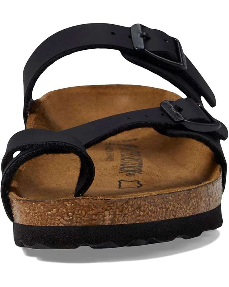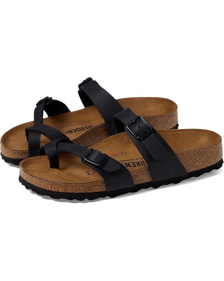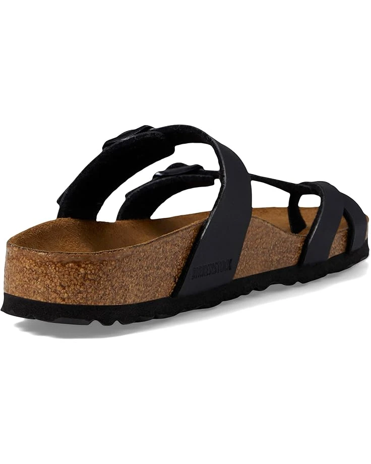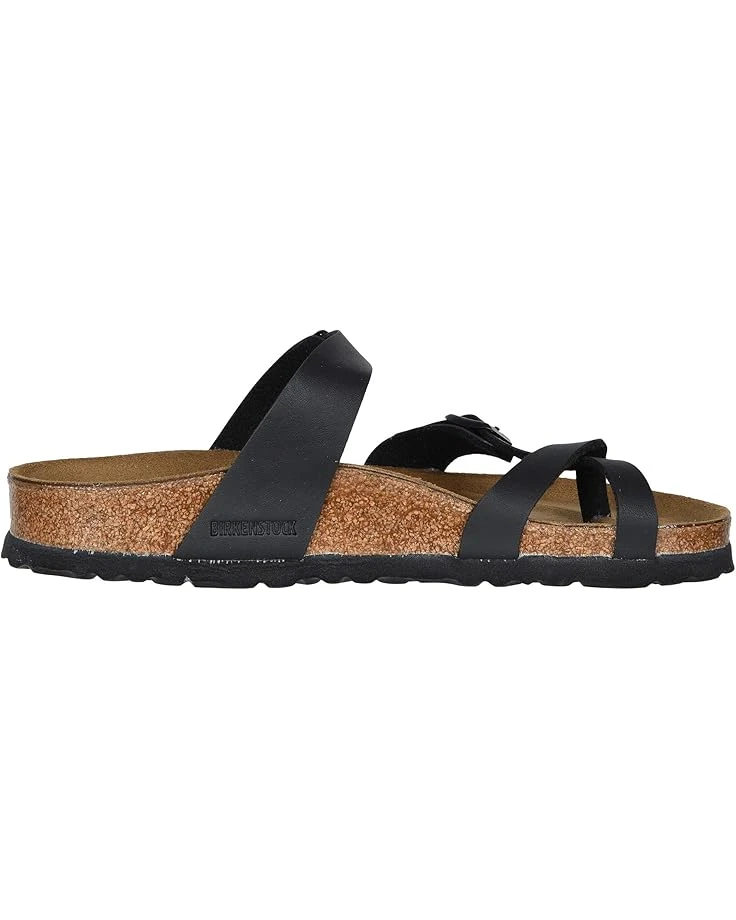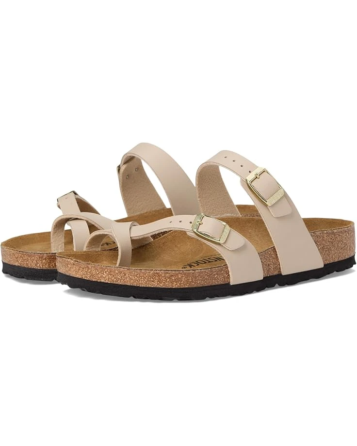 - The BIRKENSTOCK Mayari thong sandal is a jaunty model with a toe loop. The impressive combination of design and wearability will see kids through the day in style and with comfort. The upper is made from the skin-friendly, hard-wearing synthetic material Birko-Flor® in a sophisticated nubuck look which boasts a texture and color that could almost be mistaken for real leather.