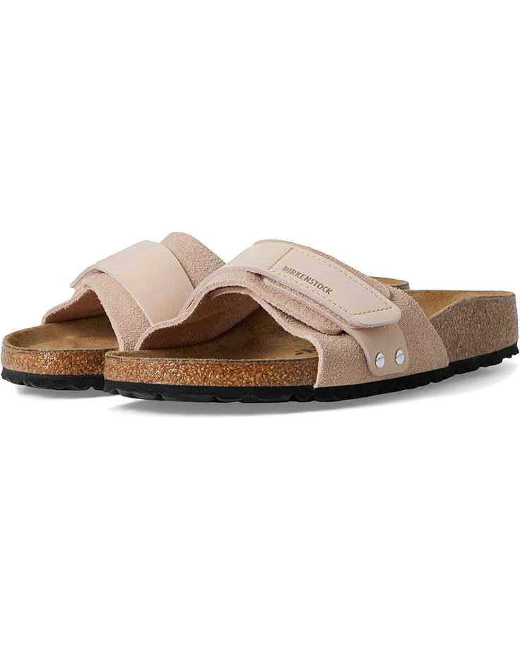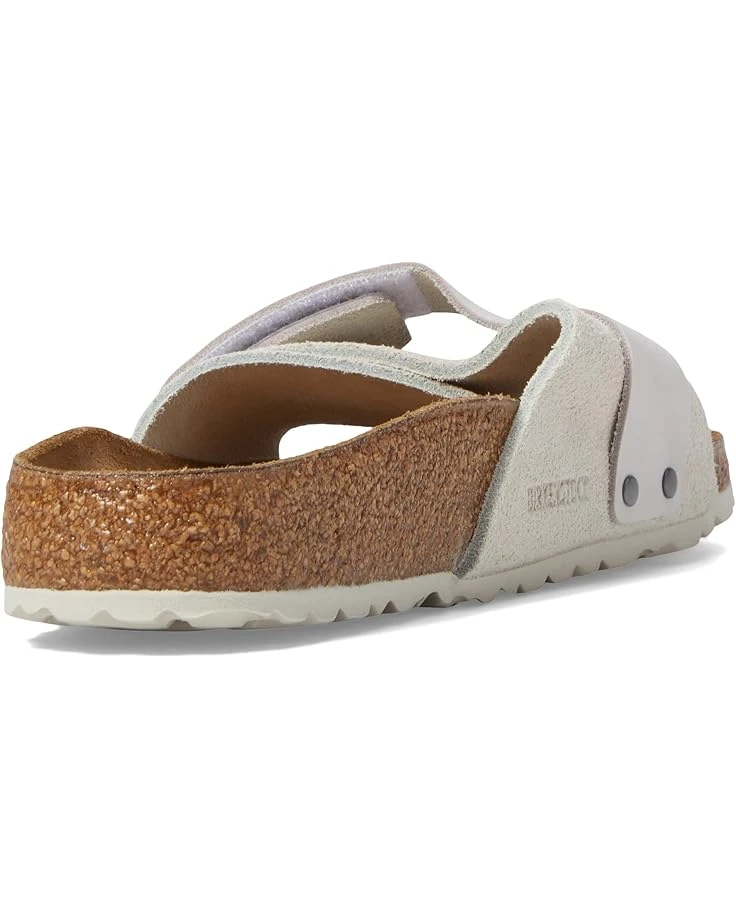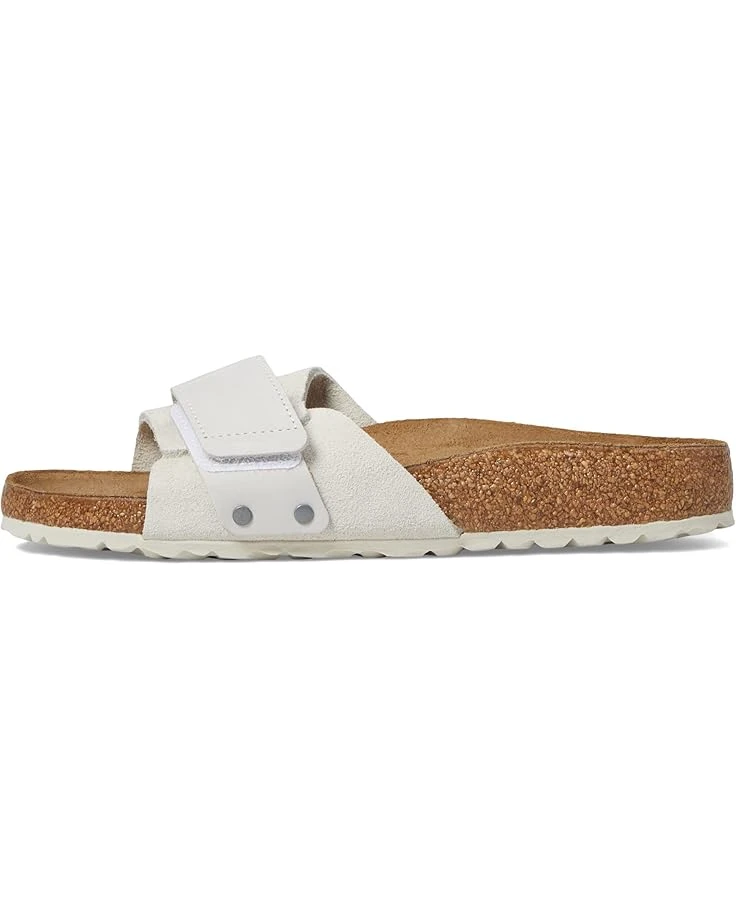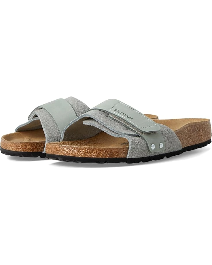 - The casual BIRKENSTOCK Oita takes its inspiration from the classic Kyoto model and stands out with its slim and feminine design and individually adjustable fastener. This offers optimum grip and is complemented by two decorative rivets. The upper is made from especially soft suede, which hugs the foot like a second skin, combined with high-quality nubuck leather.