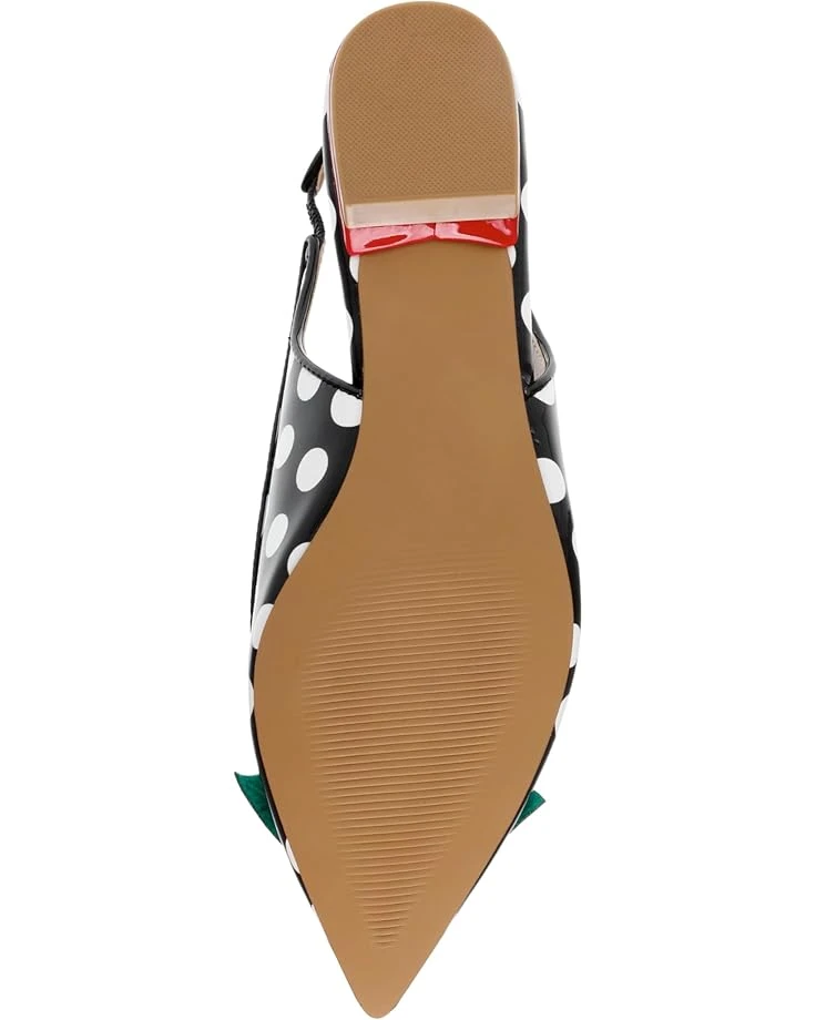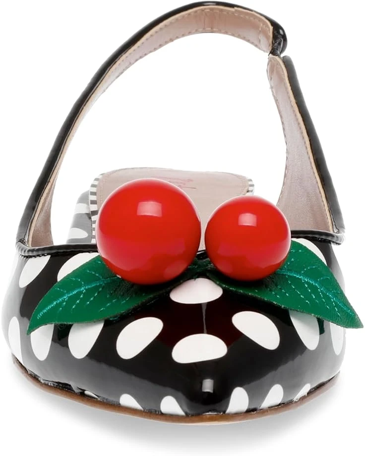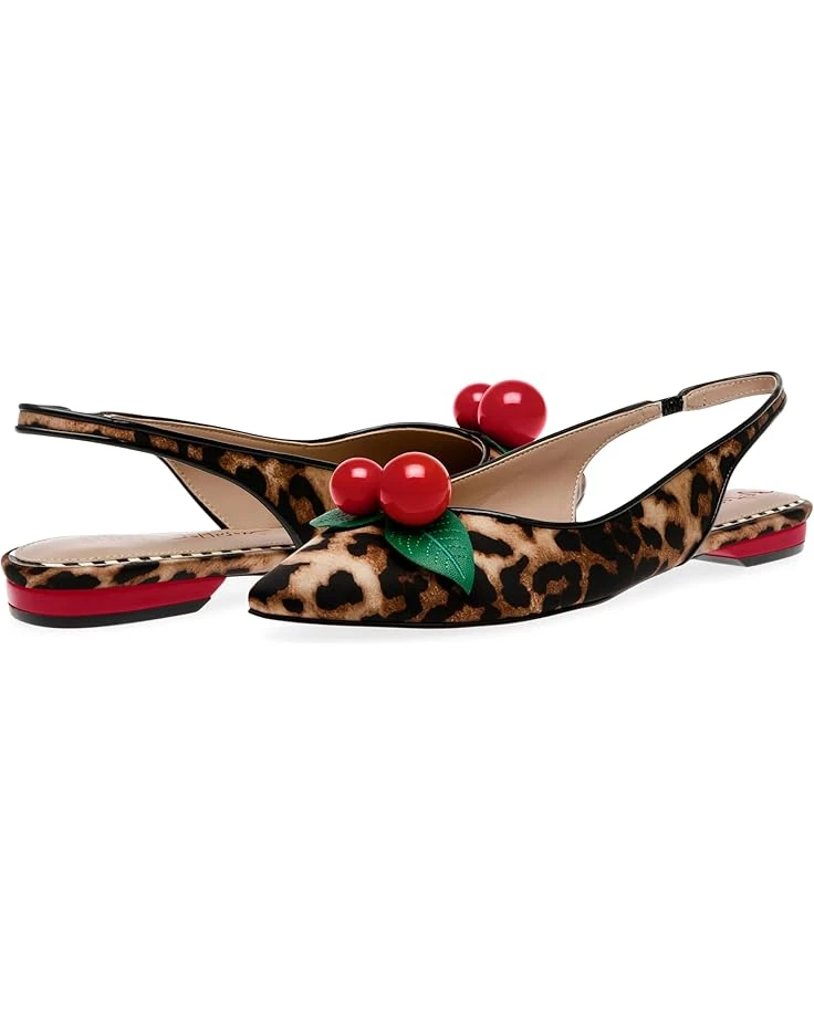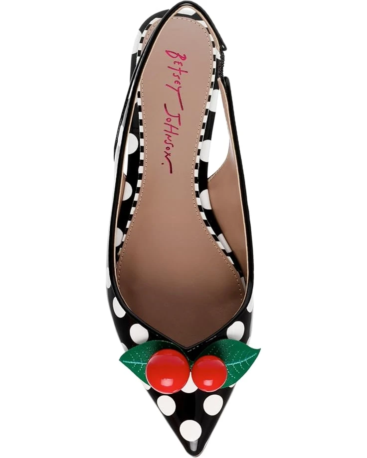 - Complement your sweet and charming personality with the whimsical touch of the Blueâ„¢ by Betsey Johnson Junniper Flats. Featured in a pointy toe silhouette with a stretch-infused slingback strap, the shoes look attractive with their sleek polyurethane upper decorated with polka dots or leopard print and cherry accents on the vamp.