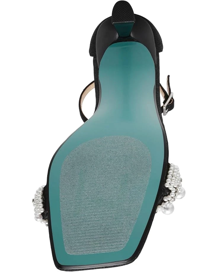 - The Blue™ by Betsey Johnson Milo sandal cuts a fresh and bold silhouette with a square toe and an angled heel with a square base. The fierce dress sandal is finished with shimmering texture and oversized rhinestones applied in layers on the front strap for bright dimensional sparkle. It comes with a polyvinyl chloride upper with adjustable ankle strap & buckle closure, synthetic rubber lining, and rubber insole.