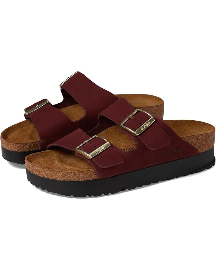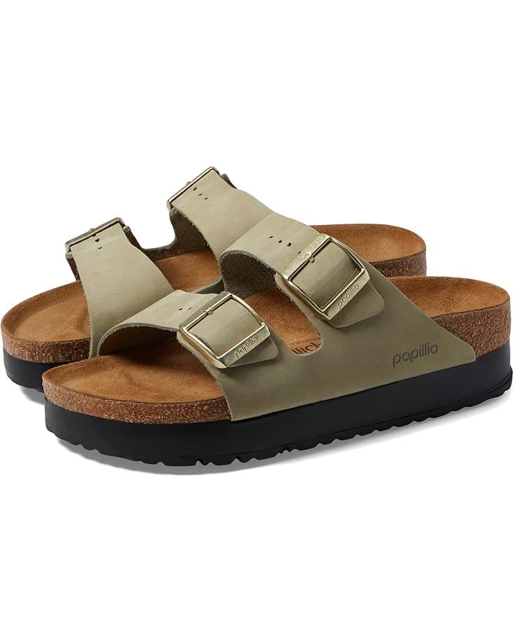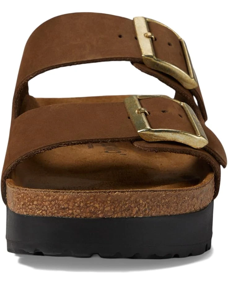 - Elevate your fashion altitude with Birkenstock® Papillio’s Arizona Platform Sandal in Nubuck. Unveiling a daring platform sole, this iconic design soars to new heights while embracing its classic roots in luxurious nubuck leather. The contoured cork-latex footbed ensures personalized support, complemented by two adjustable straps featuring metal pin buckles for a perfect fit.