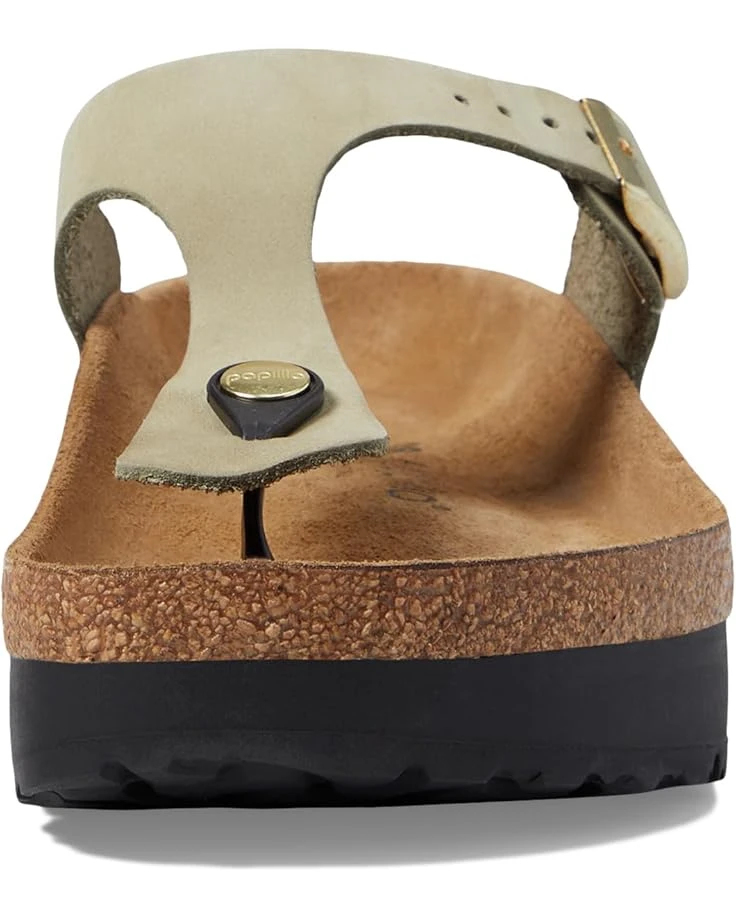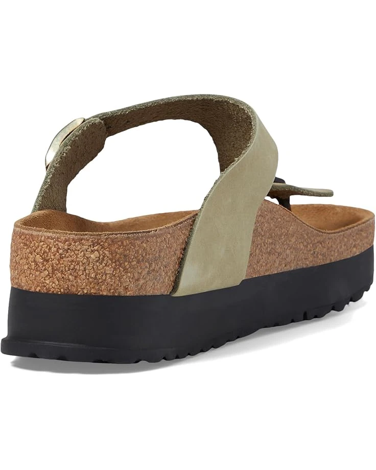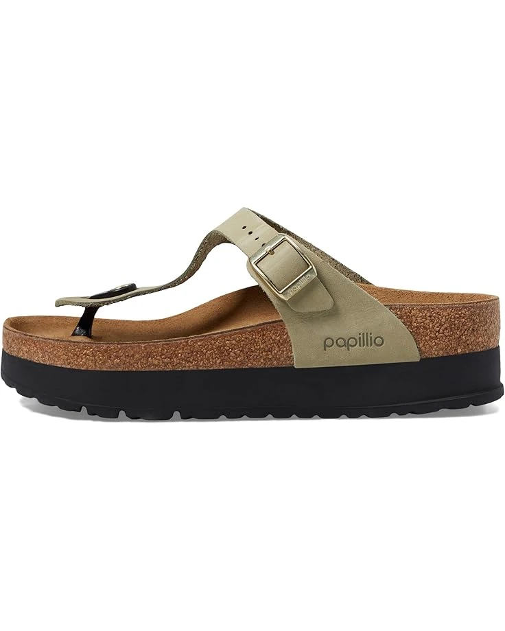 - Step into elevated comfort with the Birkenstock® Papillio Gizeh Platform Sandal – Nubuck. Elevate your style with a trendy platform and iconic contoured cork footbed for lasting comfort. The buckle closure ensures a secure fit, while the cork/latex midsole and EVA footbed material provide support that feels as good as it looks.
